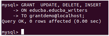 We can even assign multiple privileges to the grantdemo user using the GRANT statement. For example, let us assign UPDATE, DELETE and INSERT privileges to the grantdemo user on the table educba_writers located in the educba database. For this, we will make the use of the following query statement where the privileges to be granted are mentioned in comm-separated format –