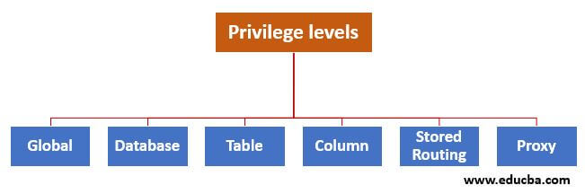 There are six privilege levels used for granting privileges to the user: global, database, table, column, stored procedure or function, and proxy, as shown in the below image.