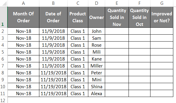 Once the formula is copied in all rows, it will compare whether the sale is improved, as shown in the screenshots below. If there is any improvement in the sale from the previous month, column G will reflect “Improvement”; if there is a decline or no improvement in the sale from the prior month, column G will reflect “No Improvement”.