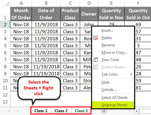 Once you select the Ungroup Sheets option, all the grouped sheets will return to normal mode.