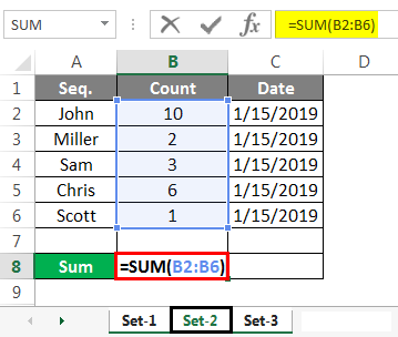 As shown in the above screenshot, we have summed column B in the Set-1 worksheet. Now let’s check whether the same formula is copied in other selected grouped sheets.