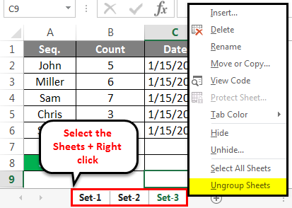 Now for Ungrouping the worksheets, select all the sheets by pressing and holding Ctrl and selecting the sheet or right click on any sheet and selecting All Sheets; then, right-click on any of the sheets shown below.
