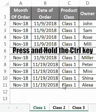 To group all the worksheets together, press and hold the Ctrl key and click on the sheet you want to select. By this, selected worksheets will be grouped. And the tabs will be embossed, as shown in the below screenshot.