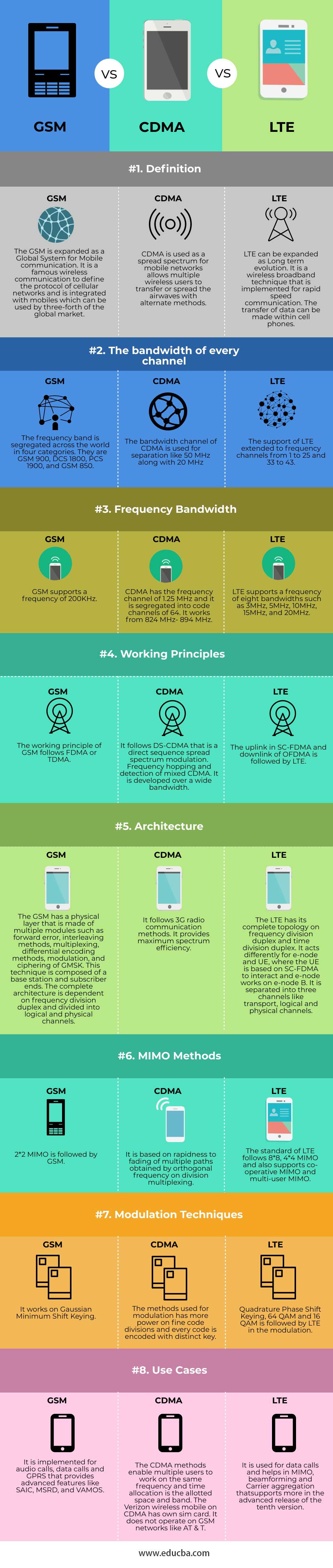 This is a guide to GSM vs CDMA vs LTE. Here we discuss the GSM vs CDMA vs LTE key differences with infographics and a comparison table. You can also go through our other related articles to learn more –