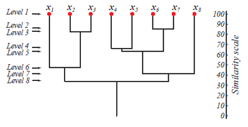 The above figure shows a dendrogram representation of the agglomeration clustering approach for 8 data points as well as the similarity scale corresponding to each level. The levels of clusters give us an idea of how similar the data points in the clusters are. As shown in fig 1, earlier the data points get merged into a cluster, the similar they are. So, the data points within a cluster at level 2 (eg. x2 and x3) are more similar than those data points in a cluster at level 6 (eg. x1 and x2).