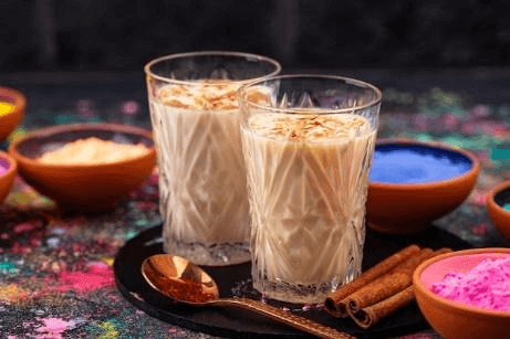 Lassi is a popular drink made with yogurt, water, spices, and sometimes fruit. During Holi, the most famous variant of lassi is thandai lassi, mixed with thandai masala powder. Bhang lassi, a cannabis-infused drink, is also prominent during the festival.