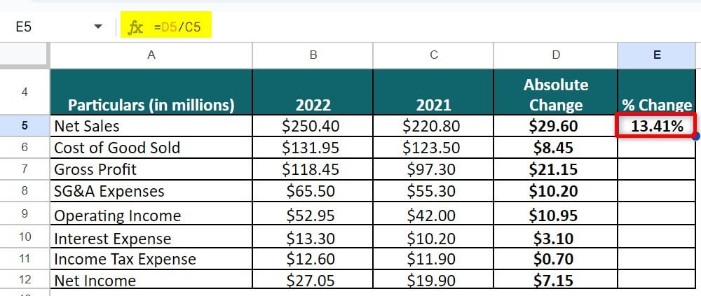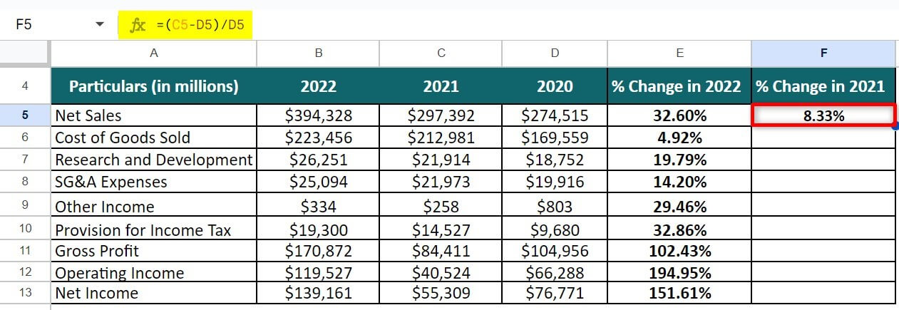 Likewise, we will then calculate % change for other particulars by dragging the formula vertically: