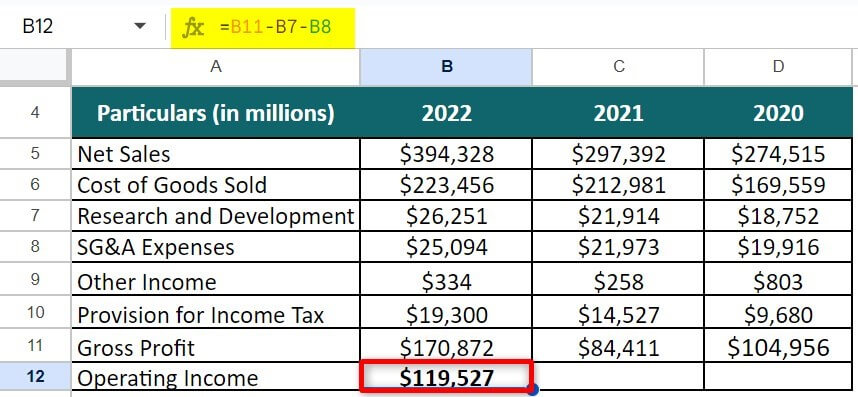 Operating Income = Gross Profit – Research and Development – SG&A Expense