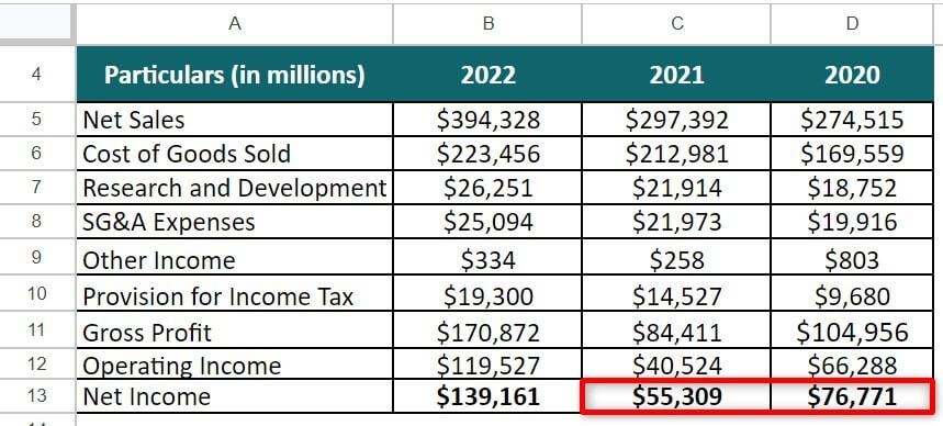 Similarly, we will calculate Net income for FY2021 and FY2020: