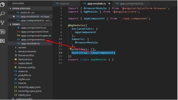Bootstrapping of Angular application starts from main.ts file, in main.ts file we have configuration for the main module to be loaded initially. As below screen at line number 11 shows in main.ts we pass bootstrap module, from this main.ts, code flows to Appmodule.