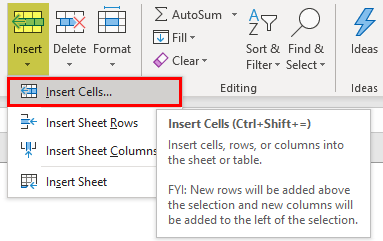 Step 3: Select the Insert Cells option, then a pop-up menu will appear below.