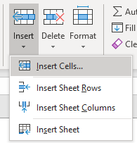 It has four options: insert cells, insert sheet rows, insert sheet columns, and insert sheet. Click on the option Insert cells to open a pop-up menu with four options as below.