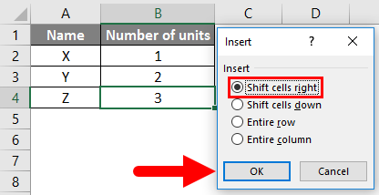 Step 4: Select the “Shift cells right” option and click OK. Then the result will appear below.