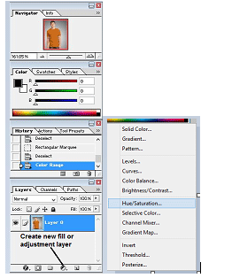 Step 8: Now next task is to click on the two-tone circle, which reads “create new fill or adjustment layer”. Hold the shift key and click on the two-tone circle. Select “Hue and saturation” from the dialog box while holding the shift key.