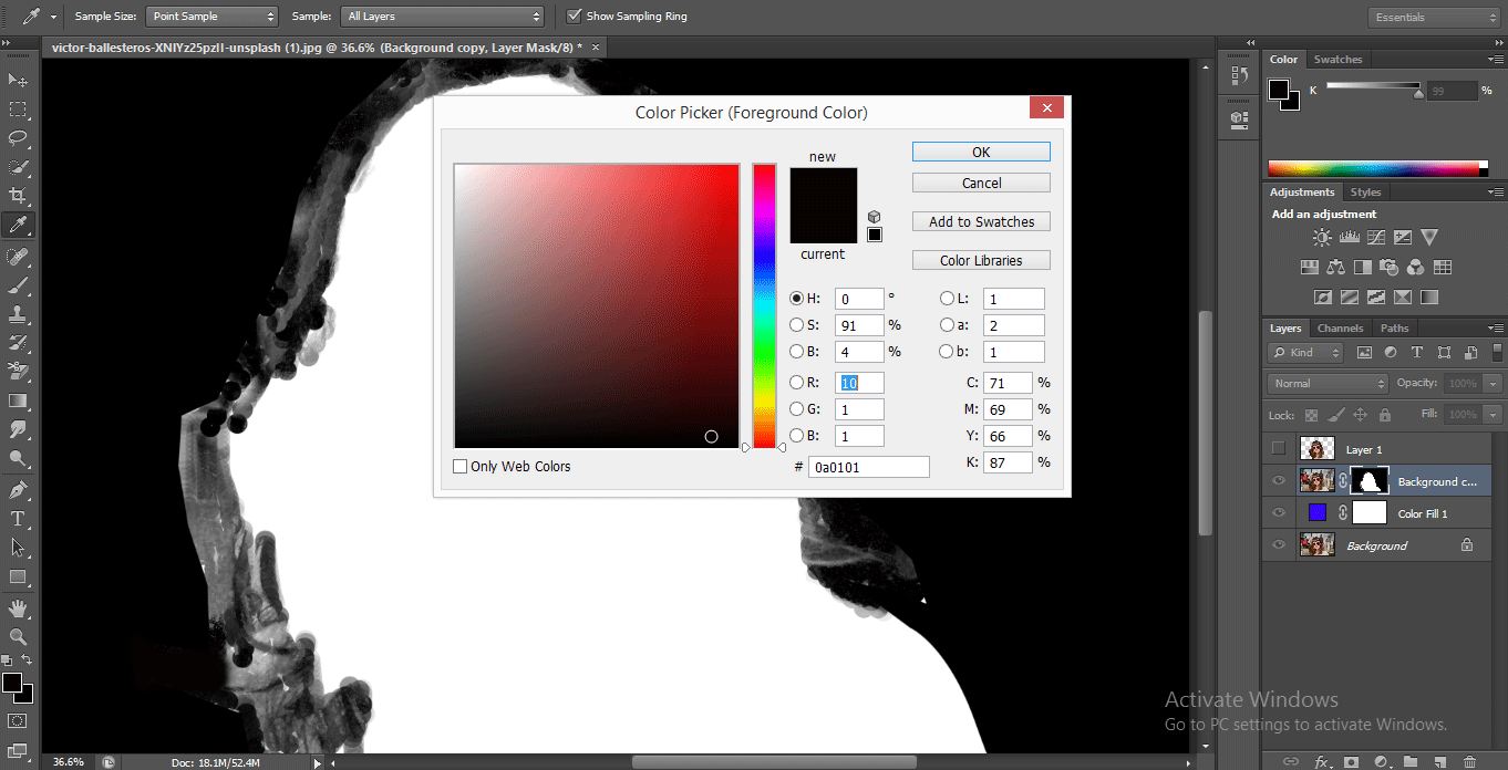 - The color pallet will be open to choosing any color from here, which you want a solid color of this layer. However, I will choose a blue color because it is the best-suited color for background removal, and you can easily see the fine hairlines in blue color.