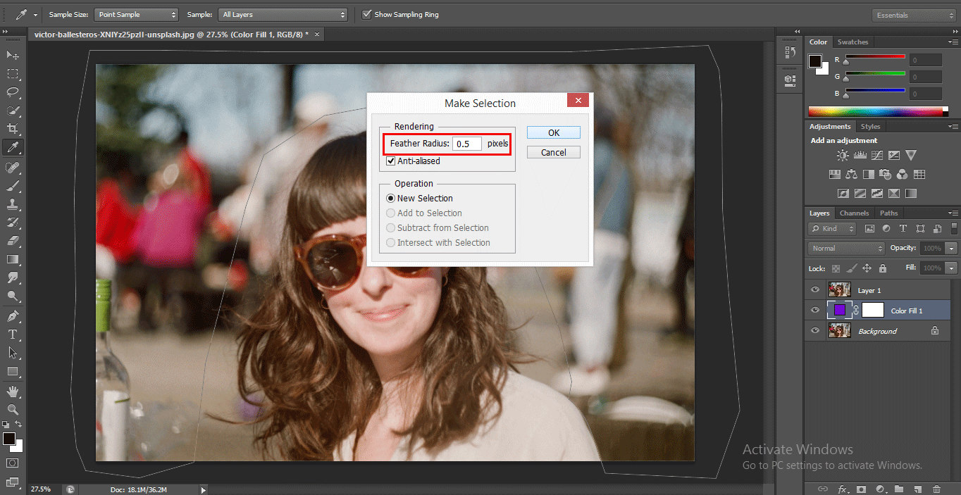 - A dialog box will be open to Make Selection. Set Feather Radius 0.5 for smooth selection, and press the OK button of this dialog box to make a selection.