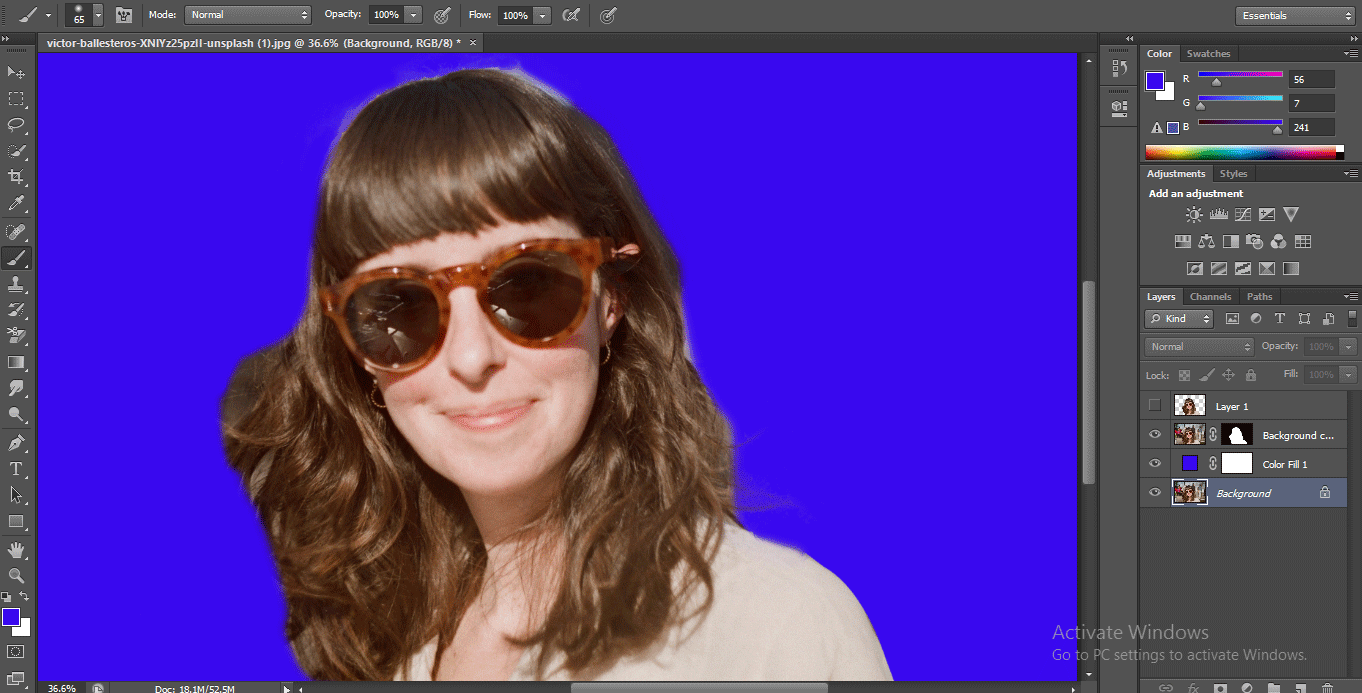 Step 7: Now click on Layer 1 and press the Delete button on the keyboard to delete the selected background area. The blue color will be shown in the background.