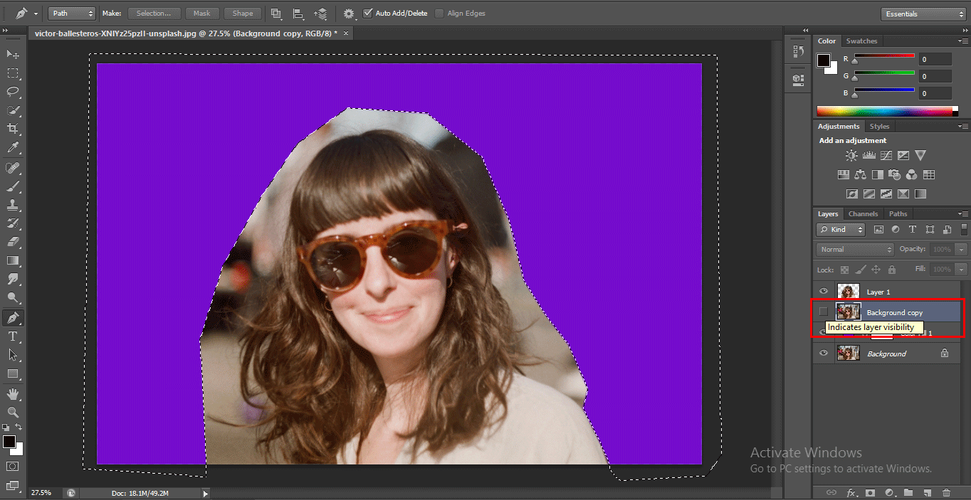 - Hide layer 1 and click on the background copy layer.