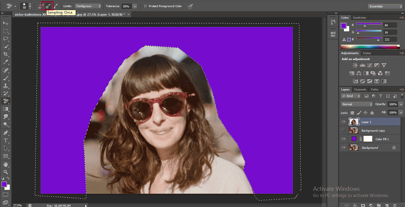 - Go to the top of the Photoshop software’s working area and select the ‘Sampling: Once’ option of the Background Eraser tool from its property.