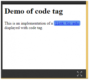 <p>This is an implementaion of a <a href="http://www.educba.com" title="online tutorial"><code>link to edu</code></a> displayed with code tag.</p>