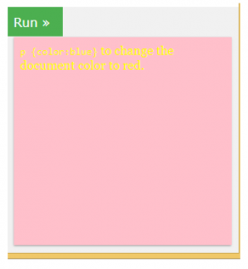 <code class="language-css">p {color:blue}</code> to change the document color to red.