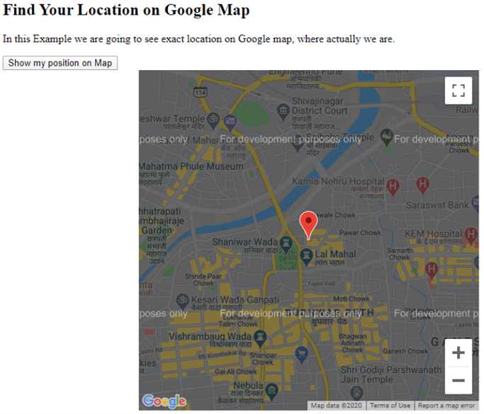 In this example, we are going to show the exact location with the HTML geolocation feature, so it will show the exact position on the map with attribute value for latitude and longitude is as follows: