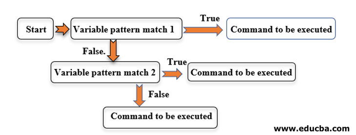 In the above example, the variable mentioned in Line 1 is checked against different patterns mention in Line 2, Line 4 respectively. If the variable matches for a pattern in Line 2, Line 3 commands would be executed and if it matches a pattern in Line 4, commands in Line 5 would be executed. The double semicolon (;;) signifies the end of commands for a particular variable match block.