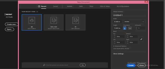 Choose your desired document size from this ‘New’ document dialog box and hit the Create button.