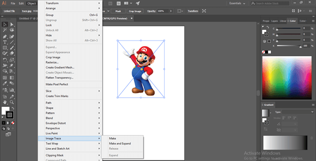 The next option is to go to the Object menu of the Menu bar and click on it. You will find the Image Trace option at the bottom of the drop-down list with its other sub-options.