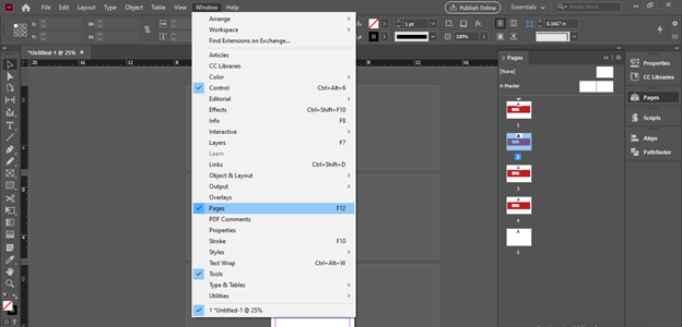 You can find this Pages Panel in the scroll-down list of the Window menu or press the F12 functional keys of the keyboard as its shortcut key.