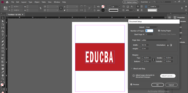 Once we click on this option a Document Setup box will open like this. We have number of parameters and settings in this dialog box such as we can increase number of pages in our document, change size of the page, set margins as well as Bleed and Slug and so on.