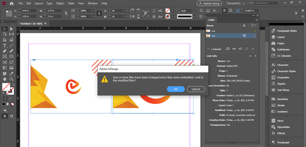 Come to InDesign again, and you can see there is a Modification sign on the top of the linked image, but there is no such icon on the embed image. So that is the difference between these two images that means you cannot update the embed image.