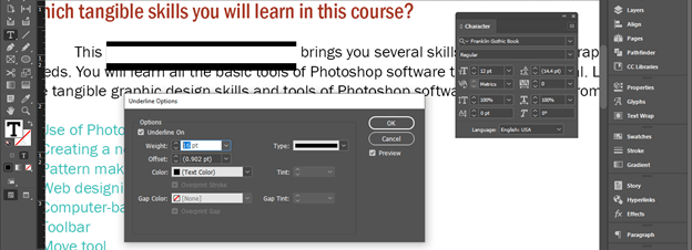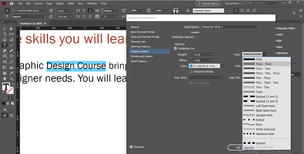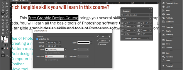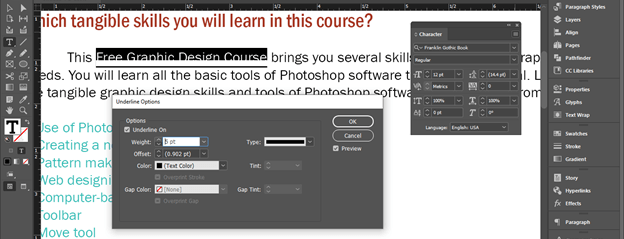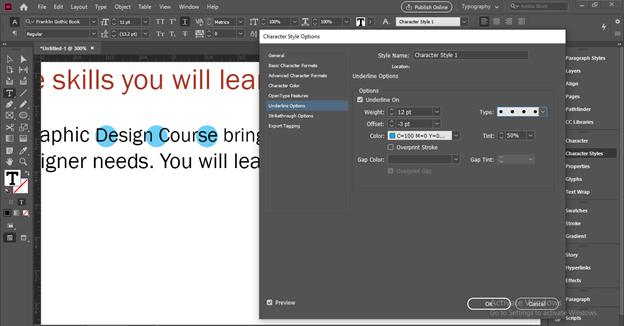 Once you make click on this option, a Character Style Options dialog box will be open. Here from the list of it choose ‘Underline Options’ and enable ‘Underline On’ option by clicking on the check box of this option. You can see once we enable this option an underline will add to our text of this character style layer.