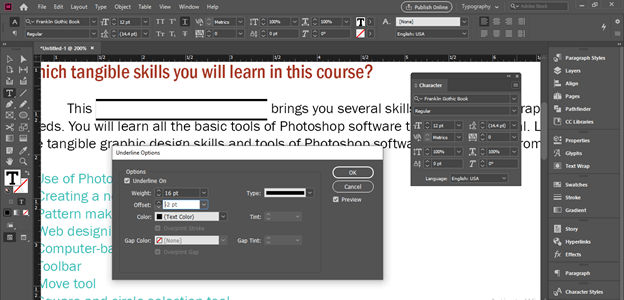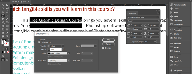 Now I will start to change the Offest value. By changing the offset value we can move to underline in an upward or downward direction. If we increase the offset value in a positive direction it will move into the downward direction.