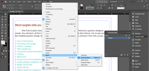 You can find this panel in the Window menu of the menu bar also. So go to this menu and then go to the Styles option of scroll down list. From the new scroll-down list of Styles menu, you will find the Character style option. You also press the Shift + F11 functional button of the keyboard as its shortcut command.