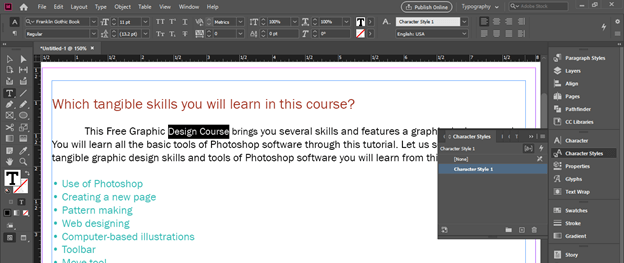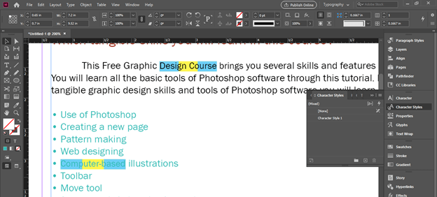 What if you want to have some type of highlight text effect on other text of document also? It may be on the same page or on any other page of the document. For this purpose, I will go with the Character Style panel. So I will open this panel from the same panel’s section of this software.