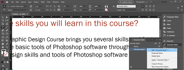Now make right-click on this Character Style 1 layer being selected and choose the ‘Edit Character Style’ option from the scroll-down list. This time you need not select text.