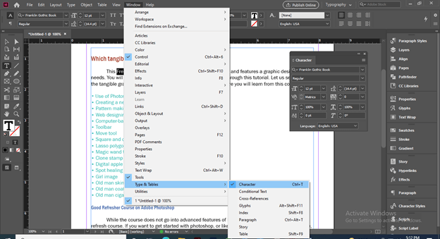 If there is no Character Panel in your user screen then you can go to the Window menu and in the scroll down list you will find the Type & Tables option. In the new scroll-down list of Type & Tables, there is a Character panel or you can press the Ctrl + T button of the keyboard as its shortcut key.