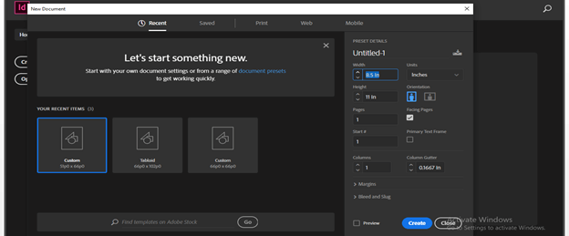 Here in the document settings dialog box, i will take a default size document page that is 8.5 in x 11 in and click on Create button of the keyboard.