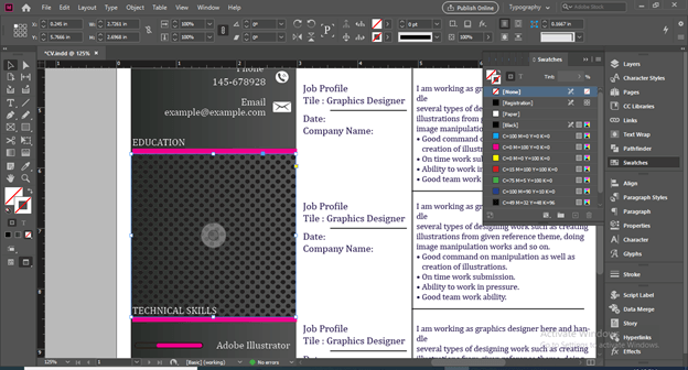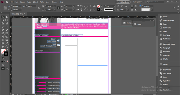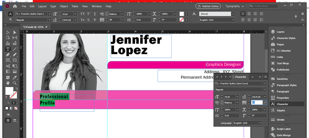 Here you can mention designation of your professional work. I am creating a resume for graphics designer so I will type designation as Graphics Designer and changes its color to white. You must create a good contrast between text and background.