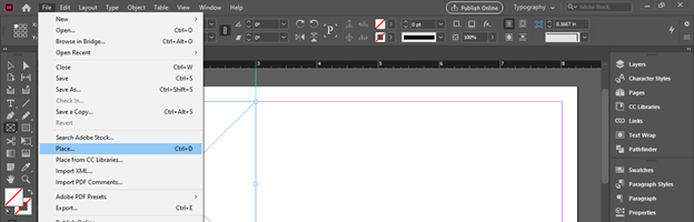 For placing a photo go to File menu and click on Place option of scroll down list or you can press Ctrl + D as its shortcut key.