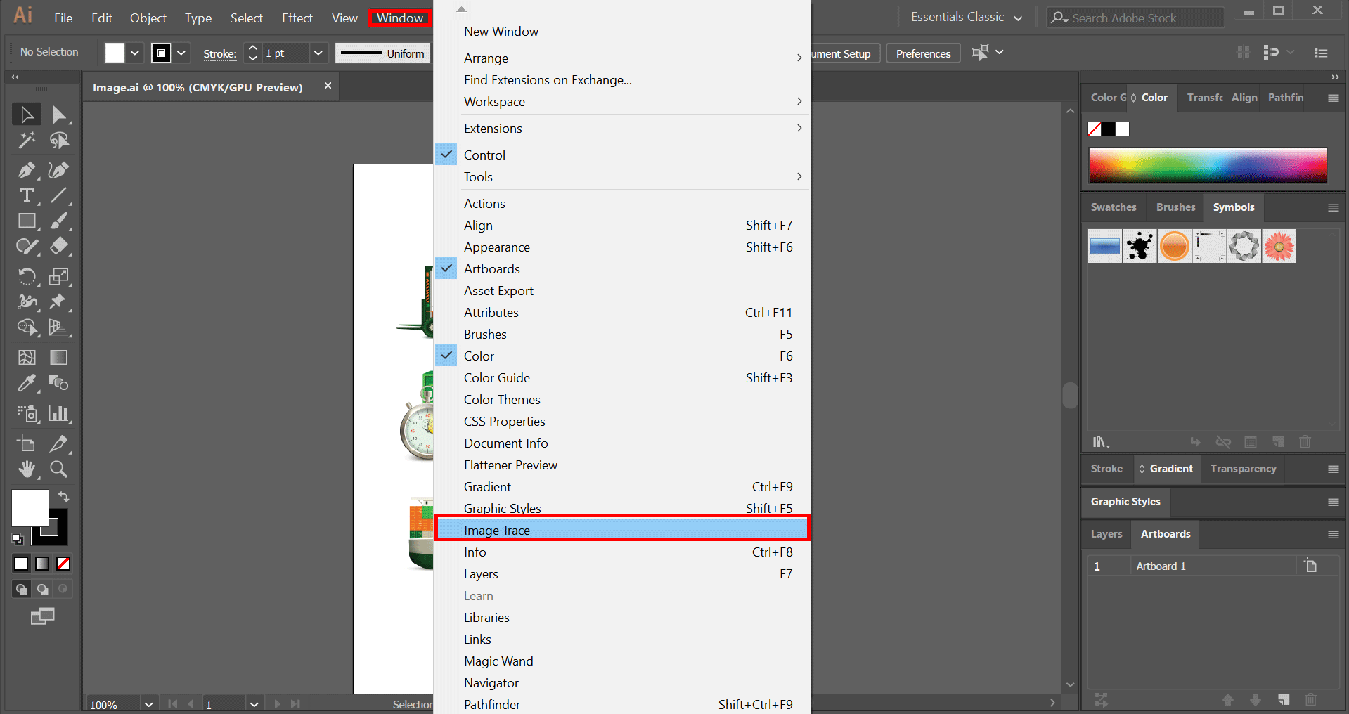 - After opening the image in Illustrator, go to Windows and choose the option Image Trace. It opens the Image Trace Panel.