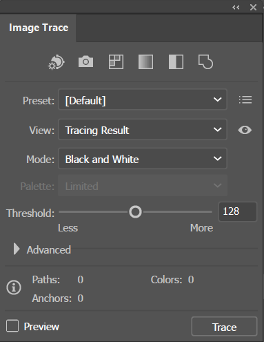 - The color mode allows you to set the maximum amount of color for tracing your image. Grayscale can be used to set an accuracy ranging from 0 to 200. Any pixels darker than the threshold value will automatically get changed into black. Below that, you will find options such as Preset, View, and Mode.