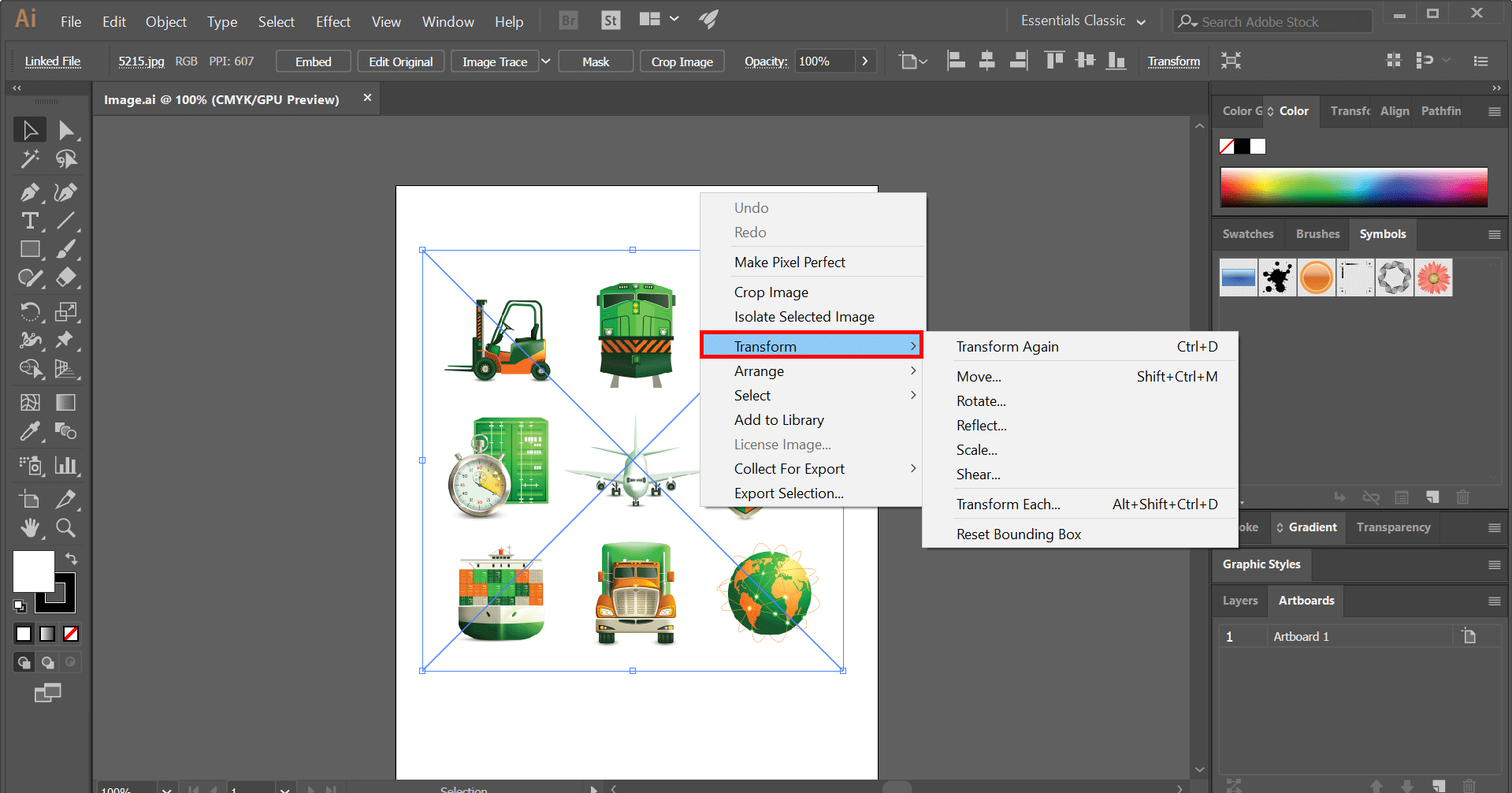 Step 7: For transforming the image for applying various options like move, rotate, reflect, scale, shear, etc., use the transformation tool. For opening the transformation tool, right-click on the image and select transform. Next, hoover to the corresponding options panel as shown in the below image. The panel contains all the above options, from rotating to scale.