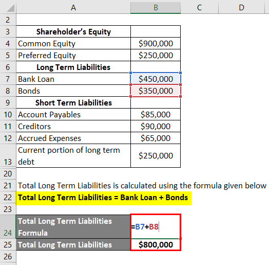 - Total Long Term Liabilities = $450,000 + $350,000