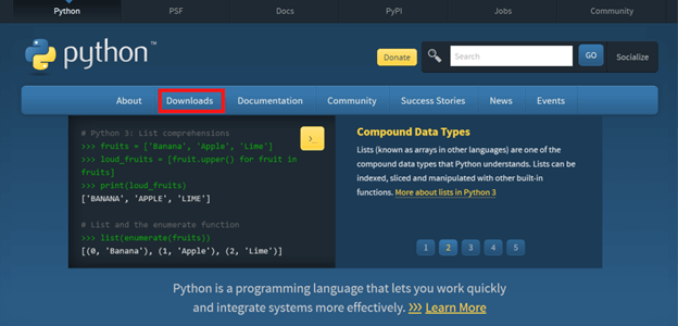 Step #1: Go to the Python official website: https://www.python.org/ and click on the ‘Downloads’ tab.