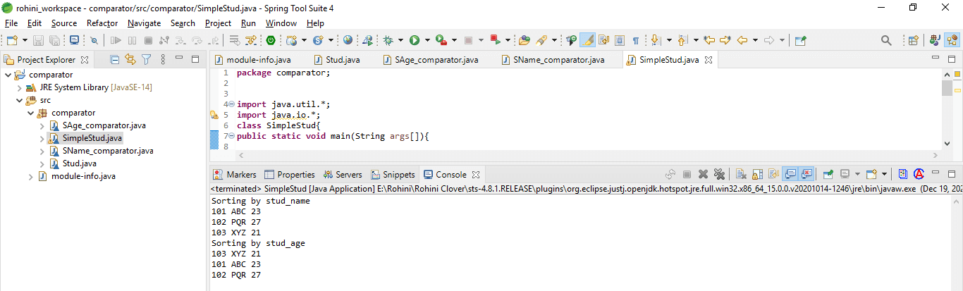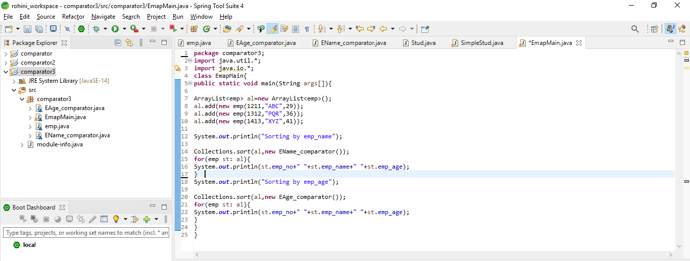 After creating the comparator classes now in this step, we are creating the java class, which contains the main method as follows.