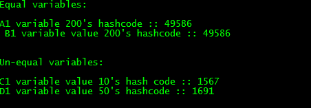 This is an example of implementing the hash codes for different variable values. If two variables are equal, those will provide an output as equal variables and then hash codes for those. Likewise, if two variable values are not equal, then under unequal variables, those variables’ hash codes will also be printed.