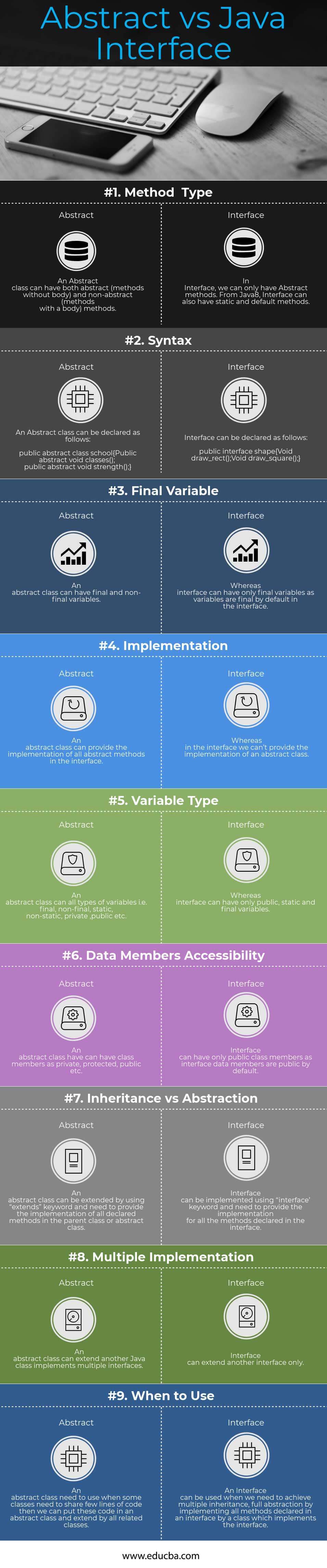 This has been a guide to the top differences between Java Interface vs Abstract Class. Here we have discussed their meaning, head-to-head comparison, key differences, along with infographics and a comparison table. You may also have a look at the following articles –