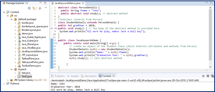 1. Abstract: Abstract The keyword is used to declare a class to be used later in the abstract program. Abstract used with a class declaration makes that class an abstract and specifies that the class will be implemented in a subclass at a later stage. Below is an example of the usage of the ‘Abstract’ keyword.